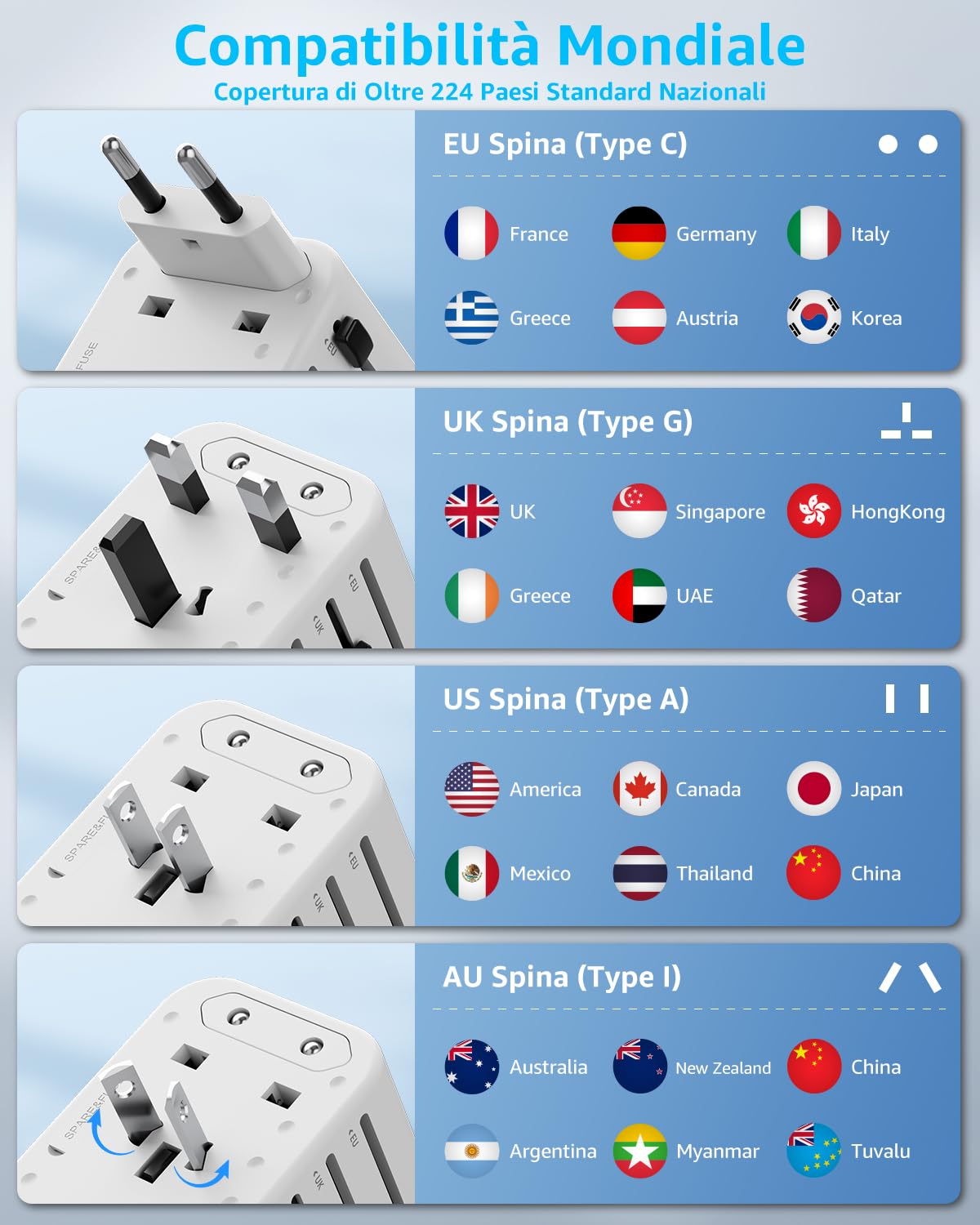 Grazie alle 4 spine intercambiabili integrate, questo adattatore copre oltre 224 paesi nel mondo, inclusi Europa, Regno Unito, America, Canada, Australia e Nuova Zelanda. Le spine si attivano facilmente tramite un sistema scorrevole intuitivo, permettendoti di adattarti istantaneamente agli standard elettrici locali.