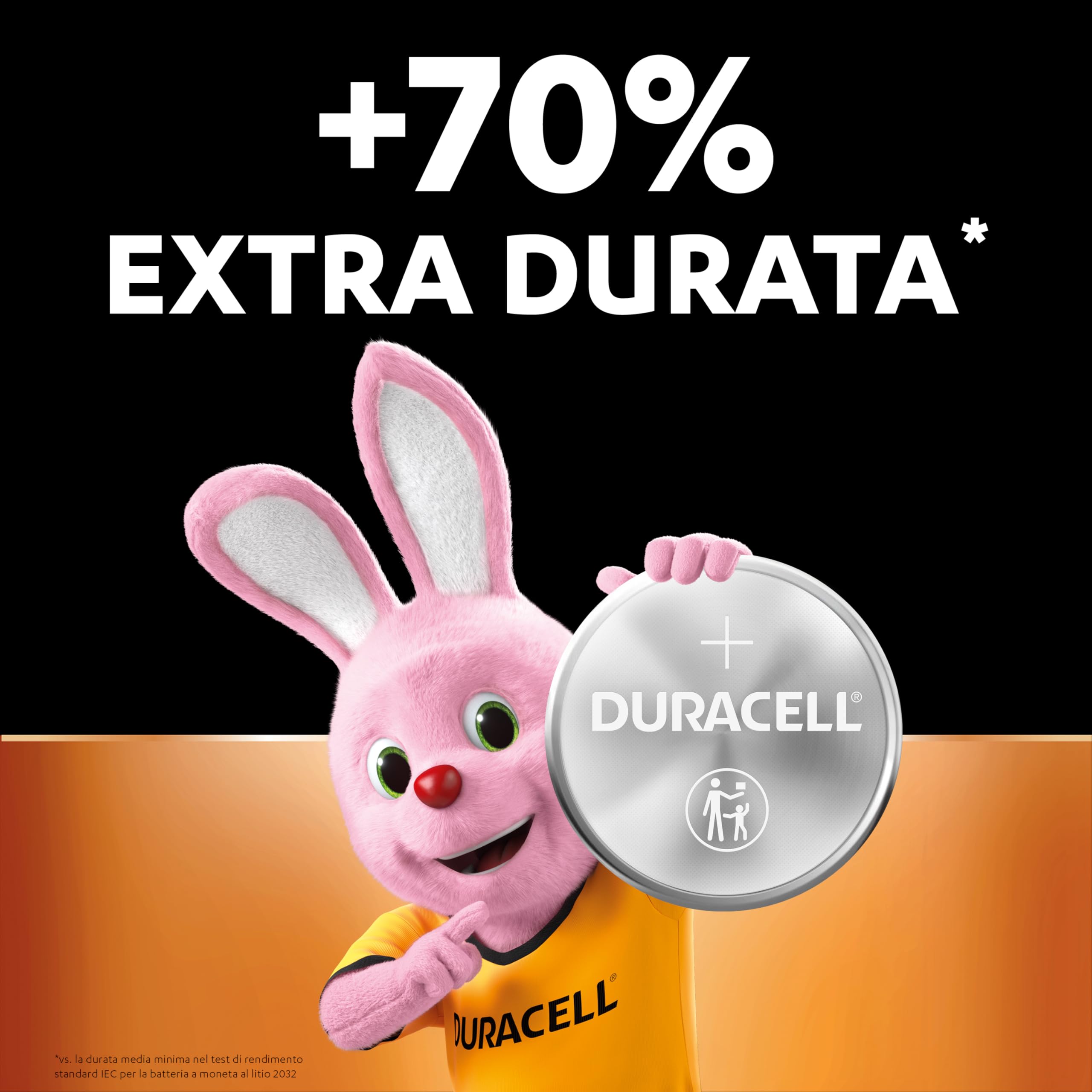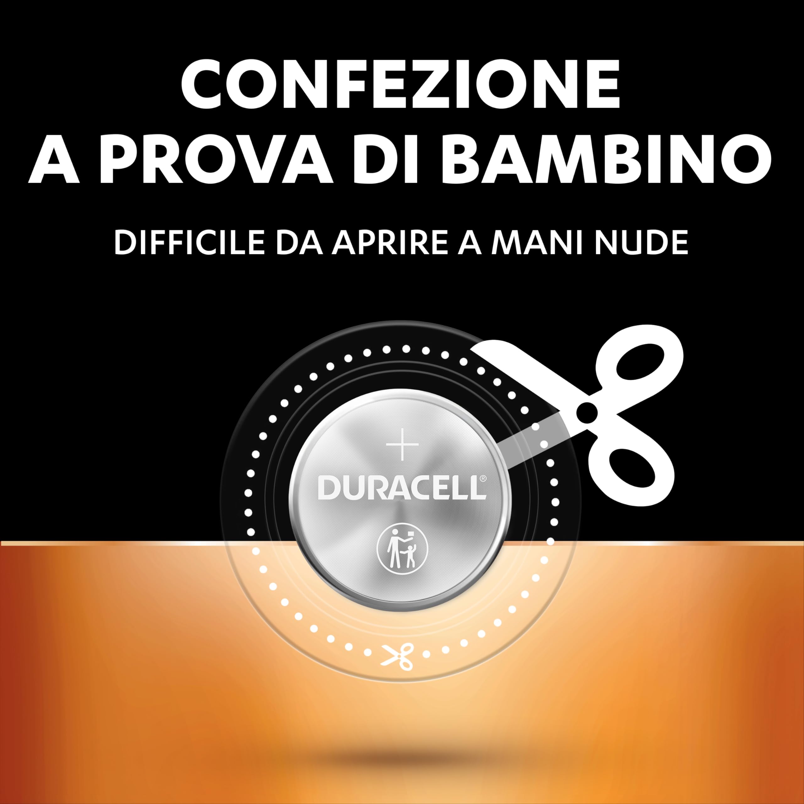 Batterie a moneta Duracell CR2032 con tecnologia Baby Secure per massima sicurezza. Offrono fino al 70% di durata in più, ideali per Apple AirTag e dispositivi smart, con protezione anti-ingestione per bambini.